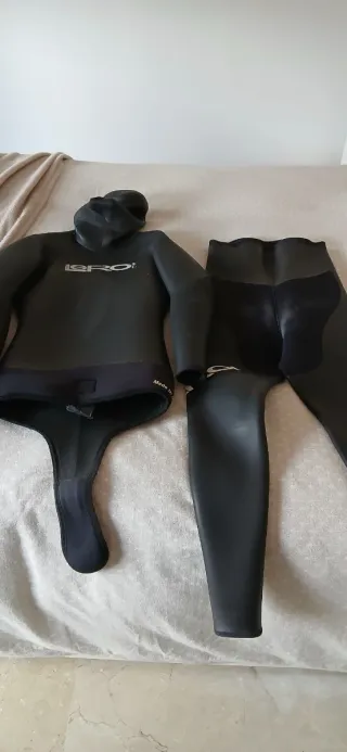 Traje de pesca submarina de neopreno negro, con capucha integrada y cierre de corchetes en la entrepierna.talla 3 pantalón 5’5 y chaqueta 7’5 - Marca: POLO SUB - Color: Negro - Material: Neopreno - Diseño con capucha - Cierre de corchetes
