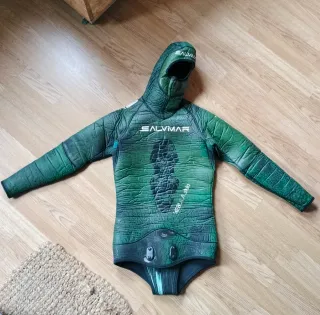 Chaqueta de pesca submarina Salvimar con un diseño camuflado inspirado en la naturaleza. - Talla M - Material: NubulaSkin 6.5mm. - Diseño texturizado. - Capucha integrada. - Con uso pero aun con mucha vida.