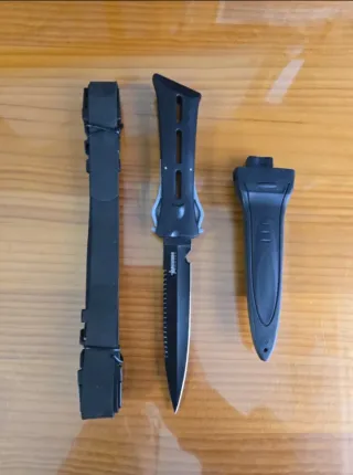 Cuchillo de buceo y pesca submarina con funda. - Hoja de acero inoxidable. - Mango ergonómico. - Funda con sistema de sujeción.