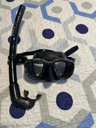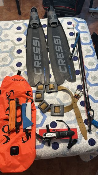 Conjunto de material para pesca submarina. - Aletas Cressi Gara Impulse 42/43. - Cinturón de lastre Spetton con 7kg de plomo. - Boya de señalización naranja. - Cuchillo de pesca. - Fusil de pesca Seac Target 75 cm. - Gafas Omer y tubo Mares. Todo comprado nuevo hace un año y medio. Vendo por no usar. Llevan 5 salidas.