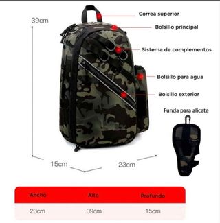 Mochila de pesca camuflada, ideal para tus salidas. Está en muy buen estado. - Compartimento principal amplio. - Bolsillo para botella de agua. - Bolsillo exterior adicional. - Funda para alicate incluida. - Sistema de complementos. - Correa superior.