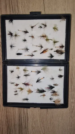 Conjunto de moscas de pesca variadas, listas para usar en tu próxima salida. -Set de 22 sin usar + set de 40 usadas. - Diseños y colores diversos. - Fabricadas con materiales de calidad. - Incluye caja de almacenamiento.