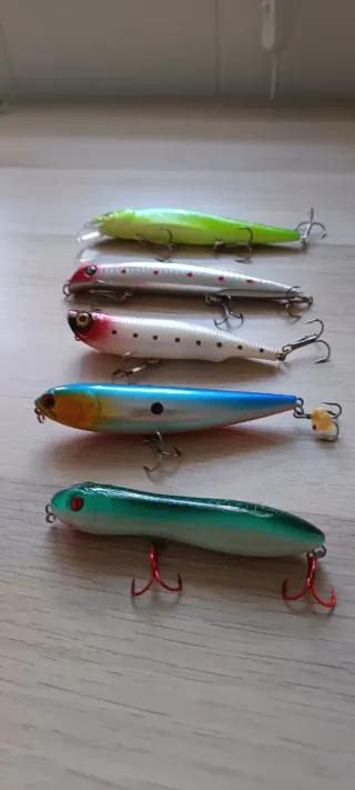 Conjunto de cinco señuelos de pesca variado. Un paseante de 10 cm 16 gr, un paseante de 11 cm 22 gr, un paseante de 10 cm 16 gr, un minnow de 13 cm 18 gr y un minnow de 14 cm 24 gr. Sin estrenar