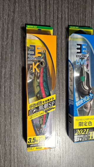 Tres señuelos de pesca EGI-OH de la marca Yamashita. - Modelo K, tamaño 3.5, 22g, color Gold. - Modelo LIVE, edición 2021, tamaño 3.5, 20g. - Modelo LIVE, edición 2019, tamaño 3.5, 21g. No leer: Calamar, chipiron, egi, dtd, naory, shimano, daiwa, Major Craft, tiprun, duel, yo zuri