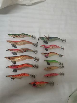 Se venden 13 señuelos de pesca. . Son ideales para la pesca. Están usados y con signos de uso pero en buen estado.. presentan una variedad de colores y diseños.... En una foto e puesto un señuelo que es el que está un poco deteriorado.. 10 EUROS TODOS. - 13 señuelos de diferentes colores. - Diseño realista de calamar. - Perfectos para la pesca de calamares.
