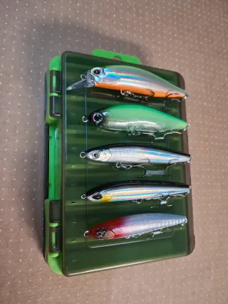 Conjunto de cinco señuelos de pesca variados, listos para usar. 1 minnow y 4 paseantes hundidos con caja de doble cara incluida, todo a estrenar. Tamaños entre 70mm y 80mm y pesos entre 7 y 12gramos. - Señuelo naranja y plateado con babero. - Señuelo verde brillante. - Señuelo plateado con reflejos azules. - Señuelo negro y plateado con reflejos. - Señuelo plateado con cabeza roja. Spinning, muestras, rapala, paseantes, lubina, robalo, pesca
