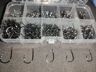 Set de anzuelos de pesca variados, organizados en una caja. - Caja divisoria transparente. - Anzuelos de metal oscuro. - Muy afilados son calidad