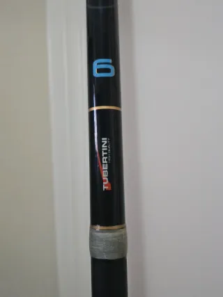 Caña de pescar de la marca Tubertini, modelo 6 metros. - Color negro con detalles dorados. - Número 6 en color azul. - Acabado de alta calidad.