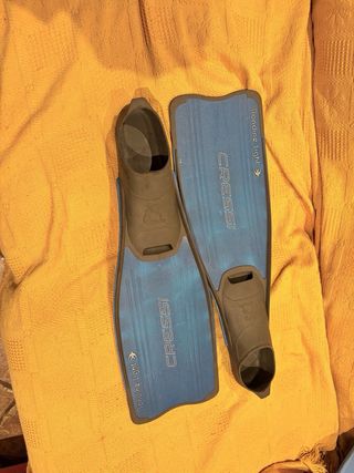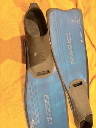 Aletas Cressi, ideales para buceo, snorkel o pesca submarina. Diseñadas para ofrecer comodidad y rendimiento. Gomas traseras nuevas (12€) a estrenar las dos. - Marca: Cressi - Modelo: Rondine Light. - talla XL 43-45 - Color azul y negro. - Diseño ergonómico. Buceo, pescasubmarina, gressi, beuchat