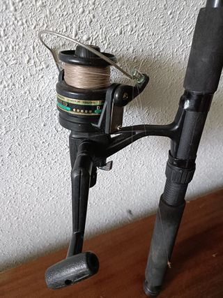 Caña de pescar negra con carrete. 61cm cerrada y 2,54cm abierta.