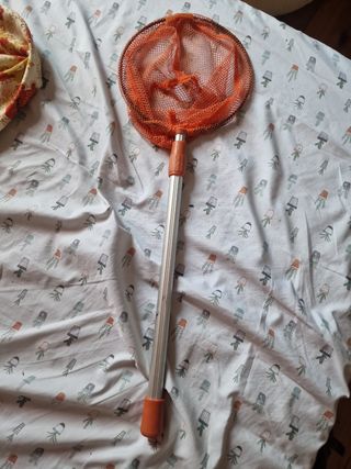 Red de pesca para niños, ideal para jugar en la playa o en el río. Está en buen estado, con un mango de aluminio resistente y una red de color naranja. - Mango de aluminio. - Red naranja. - Ideal para niños.