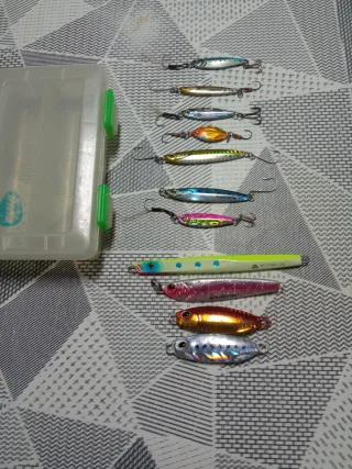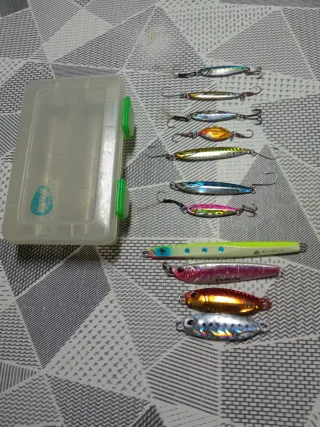 Conjunto de jigs de pesca de diferentes colores y diseños. - Varios jigs metálicos para pesca. - Diseños variados para diferentes condiciones. - Incluye caja de almacenamiento.