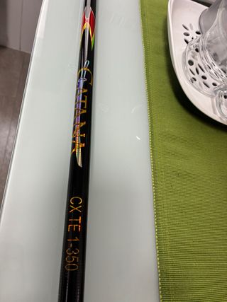 Caña de pescar Shimano Catana. - Modelo: GX TE 1.350 - Diseño con detalles en rojo, amarillo y verde.