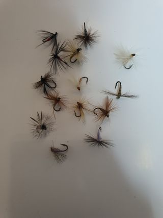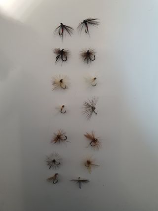 Se venden 14 moscas para la pesca de truchas. Son moscas variadas, algunas con tonos oscuros y otras más claras. Ideales para añadir a tu colección de pesca. - 14 moscas de diferentes diseños. - Colores variados: oscuros y claros. - Perfectas para la pesca de truchas.