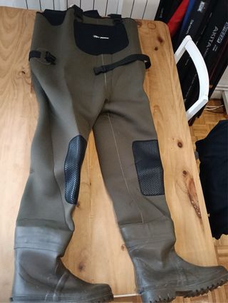 Vadeador de pesca de alta calidad, diseñado para mantenerte seco y cómodo en tus aventuras acuáticas. - Color verde oliva. - Material resistente al agua. - Tirantes ajustables. - Botas integradas.