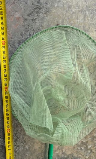 Red de pesca de color verde, ideal para capturar insectos o peces pequeños. Su malla fina permite una buena visibilidad. - Material: Malla de nylon. - Color: Verde.