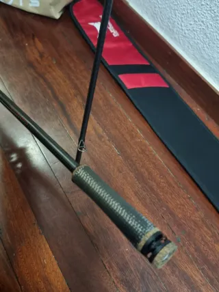 Se vende caña de pescar de estilo vintage, con un mango de madera tallada y detalles en color marrón. - Mango de madera tallada. - Detalles en color marrón. - Empuñadura metálica. 3metros con doble puntero gordo y fino santander no envio