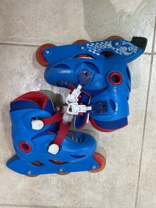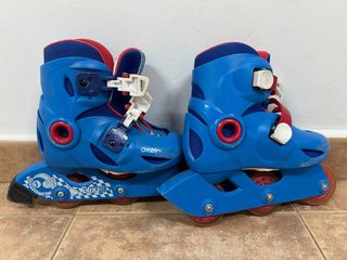Patines en línea de color azul, ideales para iniciarse en el patinaje. Cuentan con un diseño llamativo y seguro. - Talla ajustable para adaptarse al crecimiento. - Cierre de hebilla y velcro. - Ruedas de poliuretano.