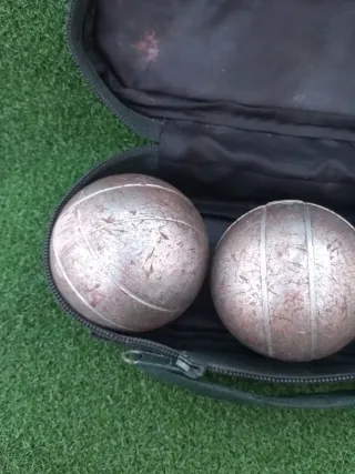 Set de tres bolas de petanca metálicas, listas para jugar. Vienen guardadas en su funda La cremallera está rota - Tres bolas de petanca. - Funda de transporte incluida. Tiene un peso de 700g y 7n diámetro de 23cm En mí perfil puedes ver mas bolas
