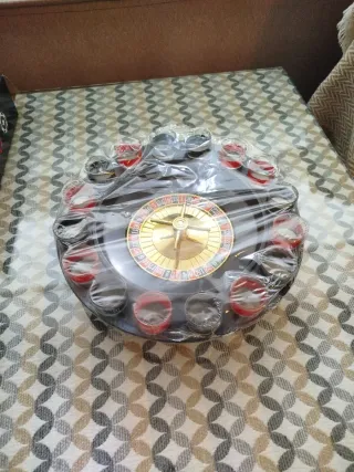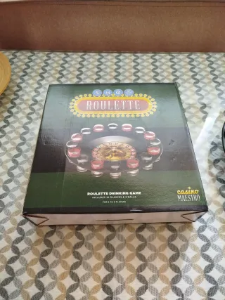 Divertido juego de ruleta para beber, perfecto para fiestas y reuniones. - Incluye 16 vasos y 2 bolas. - Para 2 a 8 jugadores. - Marca: Casino Maestro.