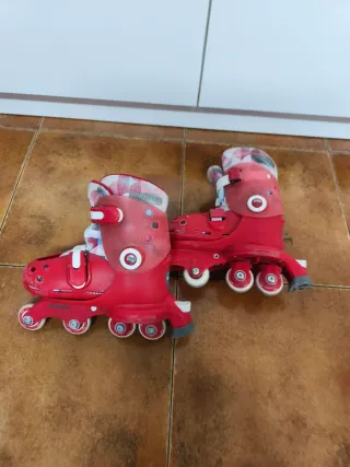 Patines de color rojo, diseñados para crecer con el usuario. - Diseño evolutivo. - Cierre de velcro y hebilla. - Ruedas de poliuretano.