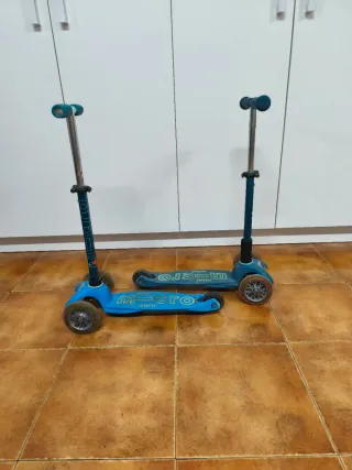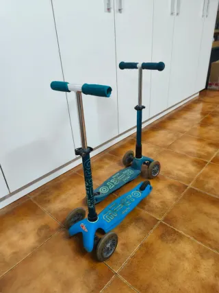 Dos patinetes infantiles de la marca Micro, ideales para los más pequeños. - Color azul. - Tres ruedas para mayor estabilidad. - Manillar ajustable en altura.