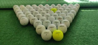 Lote de 75 bolas de golf de diferentes marcas y colores, incluyendo amarillas y blancas. - Cantidad: 75 unidades. - Variedad de marcas. - Colores: Amarillo y blanco.