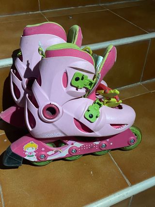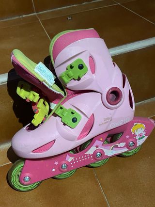 Patines en línea infantiles de la marca Oxelo, perfectos para iniciarse en el patinaje. - Color rosa con detalles en verde lima. - Cierre de velcro y hebilla. - Ruedas de color verde. - Diseño con dibujos infantiles.