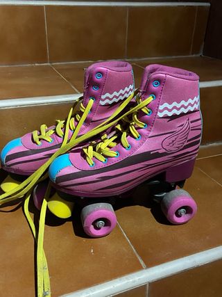 Patines en línea de la marca Fila Número del 32 al 35 - Color principal negro con detalles en rosa y blanco. - Cierre con cordones y correas de velcro. - Ruedas de color naranja.