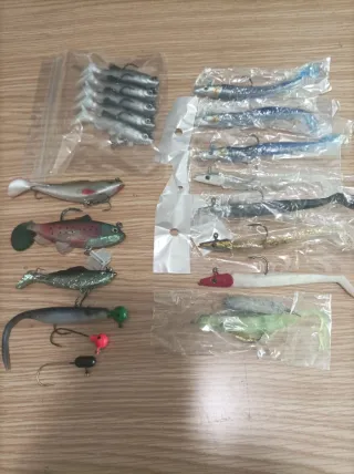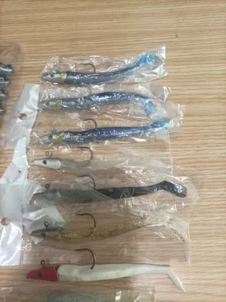 Lote variado de señuelos de pesca tipo jig, listos para usar. - Varios colores y tamaños. - Diseños realistas para atraer peces. - Incluye anzuelos y cabezas plomadas.