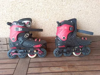 Se venden patines en línea extensibles, ideales para acompañar el crecimiento. - Diseño en color negro y rojo. - Doble cierre micrométrico. - Ruedas de 72 mm. - Talla de la 36 a la 39. - Rodilleras, coderas y muñequeras. Marca KRF modelo First, con signos de uso pero en muy buen estado, la guía no es fija, y juego de protecciones completo usado dos veces de la talla S.