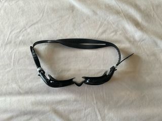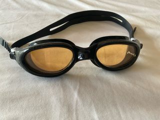 Gafas de natación con un diseño moderno y lentes de color naranja. - Montura negra. - Correa ajustable. - Lentes con tinte naranja.
