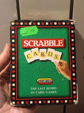 Juego de cartas Scrabble de Spear's Games. El último juego de palabras. - Caja con diseño logotipo de Scrabble. - Incluye cartas de juego nuevas. - Ideal para amantes de los juegos de palabras. La caja está pegada con cinta adhesiva, pero las cartas están perfectas.