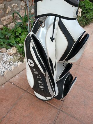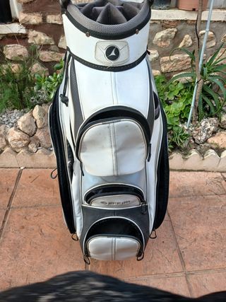 Bolsa de golf tipo caddy, con un diseño bicolor en blanco y negro. - Compartimentos superiores para palos. - Múltiples bolsillos con cremallera. - Asa para facilitar el transporte. Tiene una pequeña raja ver fotos 2 y 6 , se puede arreglar seguro , no afecta , en uno de los laterales , pero la bolsa esta realmente en buen estado a excepcion de ese pequeño detalle , cremalleras bien etc etc, Entrega en Persona