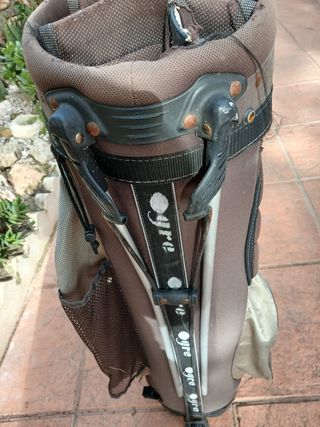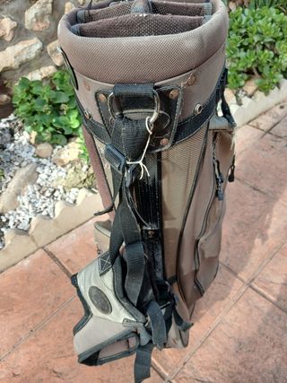 Bolsa de golf Ogre tipo caddy en color marrón de tela. Diseñada para transportar tus palos de golf con comodidad. Tiene pequeño descosido pero se puede arreglar facilmente. Por lo demas sin problema, tripode de apoyo. Entrega en persona. Varios Bolsillo cremalleras asas para transportar comodamente - Compartimentos superiores. - Correas de sujeción. - Bolsillos con cremallera.