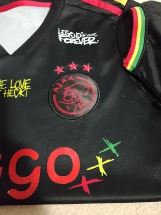 Camiseta de fútbol del Ajax con un diseño especial. - Logo del Ajax con tres estrellas. - Inscripción Legends Live Forever. - Detalle de colores Rasta en las mangas.
