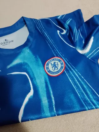 Camiseta de fútbol del Chelsea FC. - Diseño azul con detalles blancos. - Escudo del club bordado en el pecho.