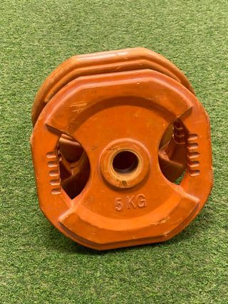 Set Bodypump completo, incluye: - 1 barra - 2 discos de 1,25 kg (amarillo) - 2 discos de 2,5 kg (verde) - 2 discos de 5 kg (naranja) - 2 cierres de seguridad Ideal para entrenamientos de fuerza, tonificación y Bodypump en casa. Todos los elementos están en buen estado y listos para usar. Perfecto para completar tu material de gimnasio o empezar tu propio set. Puedo ajustar el precio si compras más material del perfil.