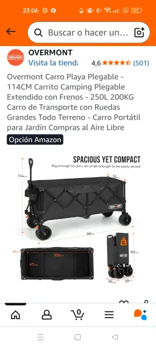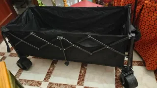 Carro plegable ideal para playa, camping o jardín. Con ruedas grandes todoterreno y frenos. - Capacidad: 250L / 200KG. - Dimensiones extendido: 124cm largo x 0'60 alto. - Dimensiones plegado: 65cm alto x 40cm ancho - Ruedas grandes para todo tipo de terreno. - Incluye frenos para mayor seguridad. Colchoneta en el fondo desmontable de refuerzo , super fuerte con doble asa para llevar colgado o en mano ,cerrado se queda super recogido . Está nuevo en su caja compré para regalo pero lo necesita más pequeño, recoger en Pilas. Me costó 140 pero lo compré fuera de Andalucía y ya no puedo cambiarlo por eso si venta .
