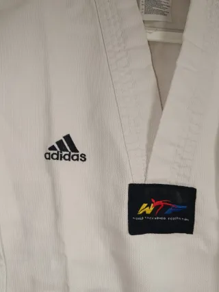 Dobok de taekwondo de la marca Adidas, con el distintivo de la World Taekwondo Federation (WTF). - Logo de Adidas bordado. - Parche de la WTF bordado. Pequeña manchita en espalda,añado foto. Tela un poco tiesa, del poco uso.