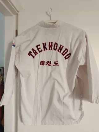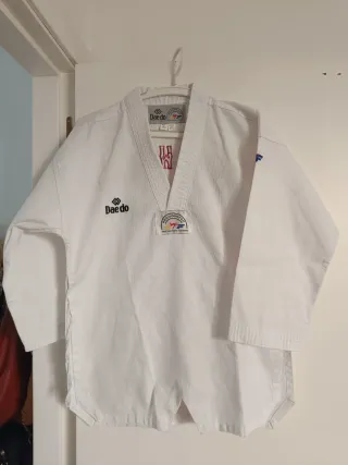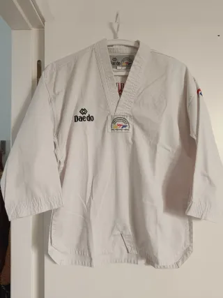 Dobok de Taekwondo de la marca Daedo, talla 140. - Chaqueta blanca. - Pantalón blanco. - Logo de Daedo bordado en la chaqueta. - Parche de WT (World Taekwondo) reconocido en la chaqueta. - Tela cómoda,por los lavados y uso.