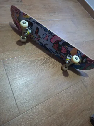 Tabla de skate con un diseño gráfico llamativo en la parte superior. La lija negra cubre la mayor parte de la superficie. - Diseño con colores morados, azules y blancos. - Estampado central con figura abstracta.