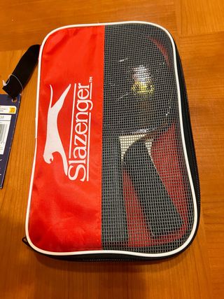 Funda para transportar raquetas con raquetas y pelotas de ping pong de la marca Slazenger.