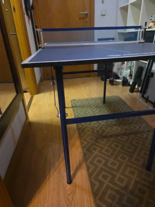 Mini mesa de ping pong con red. Tiene un golpecito en una esquina cono aprecias en las fotos. - Color azul. - Medidas: 120x70 cm.