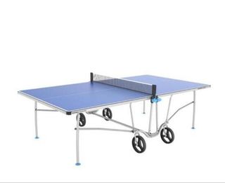 Mesa de ping pong de color azul, ideal para jugar en exteriores. Se pliega fácilmente para guardarla. - Marca: DECATHLON PONGORI - Estructura metálica - Ruedas para transporte