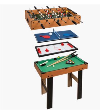 Divertida mesa multijuegos que incluye varios tableros intercambiables para disfrutar de diferentes actividades. - Incluye mesa de billar, futbolín, hockey, ping pong, ajedrez, bolos y, aros, etc - Ideal para pasar tiempo en familia o con amigos. la único que no está bien es que las patas eran muy malas y se rompieron pero se puede poner encima de cualquier mueble