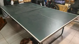 Vendo mesa de ping pong / tenis de mesa. La estructura metálica está impecable, muy robusta y estable. El tablero necesita restauración (lijar y pintar o sustituir la superficie), por eso se vende a bajo precio, pero la base, patas y soportes están en muy buen estado, por lo que es una excelente base para dejarla como nueva. Incluye red y dispone de ruedas para moverla fácilmente. Ideal para jardín, terraza, casa rural, garaje o zona de juegos.