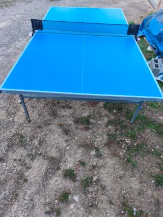 Mesa de ping pong de color azul, ideal para jugar en exteriores o interiores. Es plegable y cuenta con ruedas para facilitar su transporte y almacenamiento. - Superficie de juego azul. - Estructura metálica. - Ruedas para movilidad. - No tiene ninguna abolladura en la superficie, está impecable. - ha estado mucho tiempo guardada con una manta en el garaje que se ve am fondo.