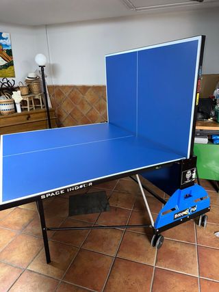 Mesa de ping pong SPACE INDOOR bomerang con superficie azul. - Tablero azul con líneas blancas. - Estructura metálica. - Ruedas para facilitar el transporte.