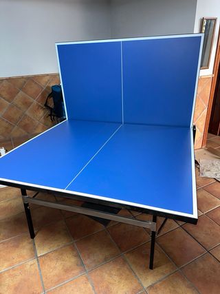 Mesa de ping pong para uso en interiores. Superficie de juego azul con líneas blancas. - Diseño plegable para fácil almacenamiento. - Estructura robusta. - Medidas: 274 x 152,5 x 76 cm. No incluye: estructura red (incluir por 5€ más red portátil decathlon), ni palas y pelotas. Defectos: esquina lateral con cinta negra despegada, falta anillas de ayuda para desplegar el tablero, superficie algo levantada a la altura de la red, anilla sujeción soporte rajada.